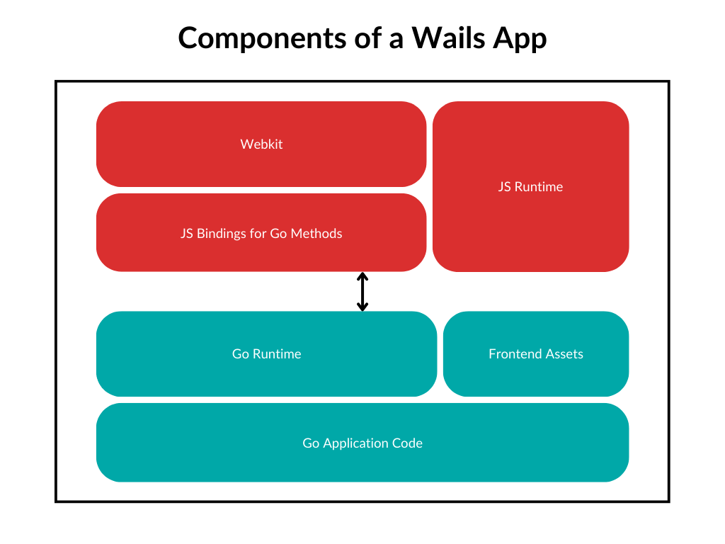 A Wails application is a standard Go application, with a webkit frontend. The Go part of the application consists of the application code and a runtime library that provides a number of useful operations, like controlling the application window. The frontend is a webkit window that will display the frontend assets. Also available to the frontend is a JavaScript version of the runtime library. Finally, it is possible to bind Go methods to the frontend, and these will appear as JavaScript methods that can be called, just as if they were local JavaScript methods.